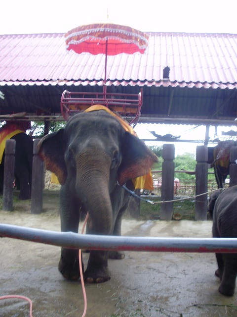 悪質なのが多いから初めは断っていましたが、エレファントキャンプまで距離がある上に、雨もまた振りだし、40バーツで乗っけてくれるというから、そこまで連れてってもらいました。